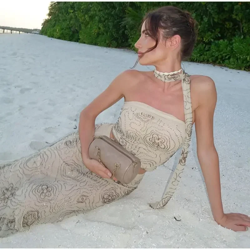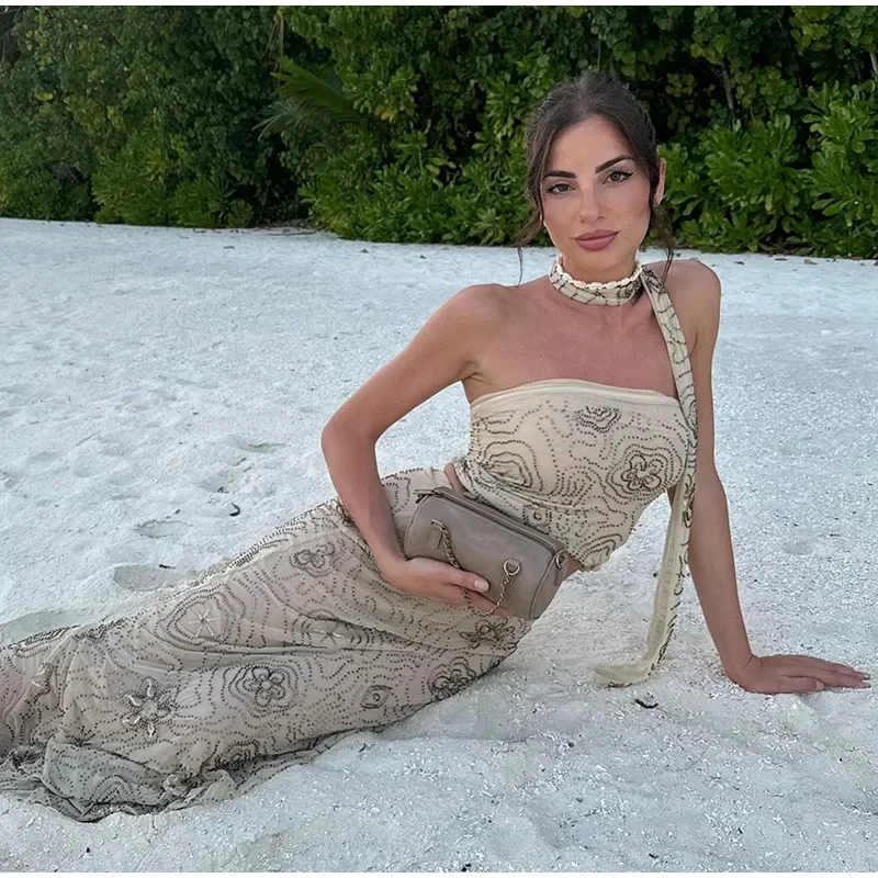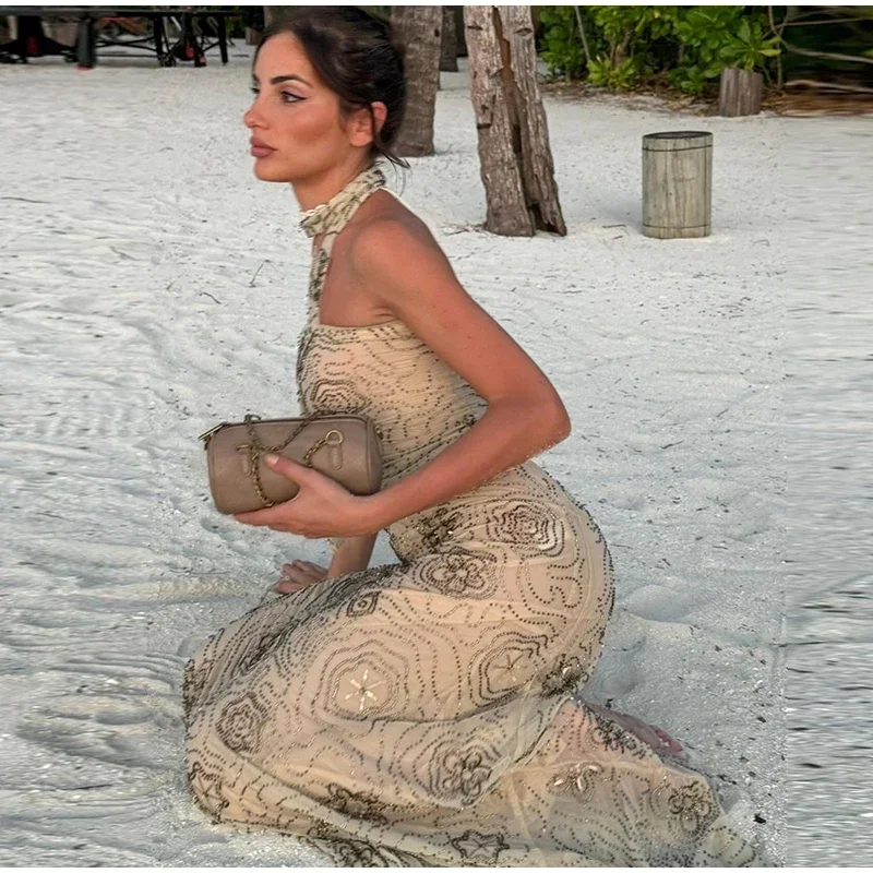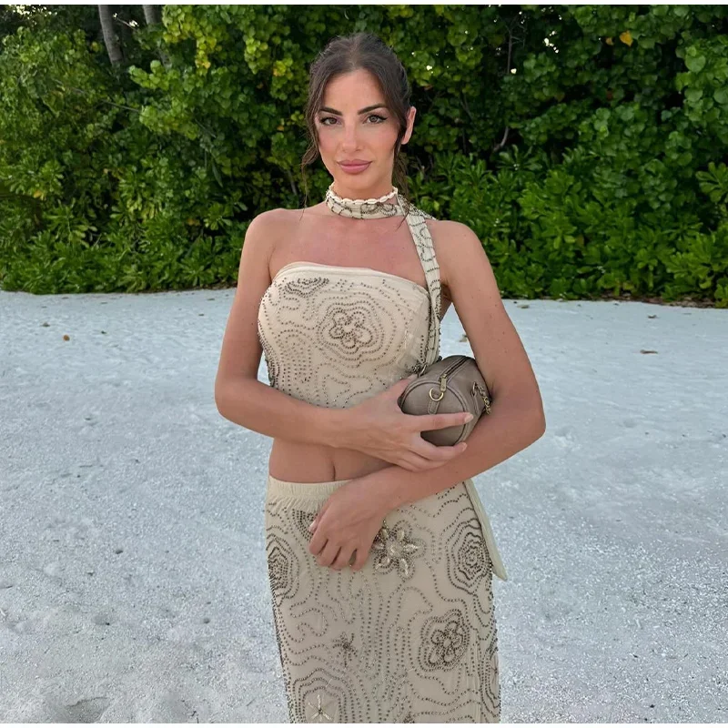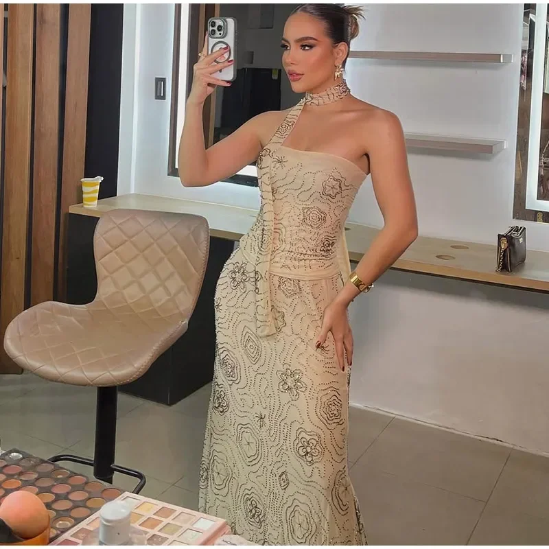 2025 Elegant Women's Beaded Halter Top Skirt Set Sexy Sleeveless Printed 2-piece High Waist Long Skirt Beach Party Club Outfit