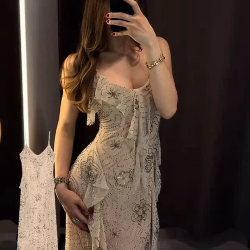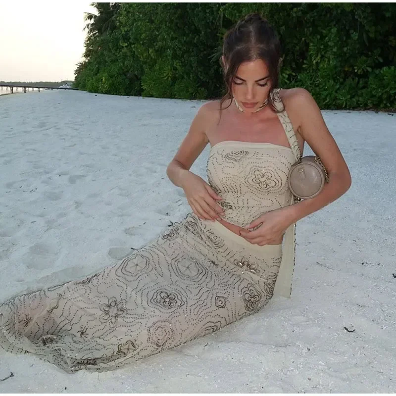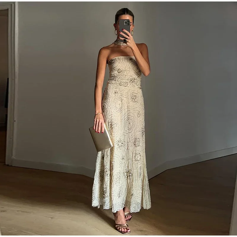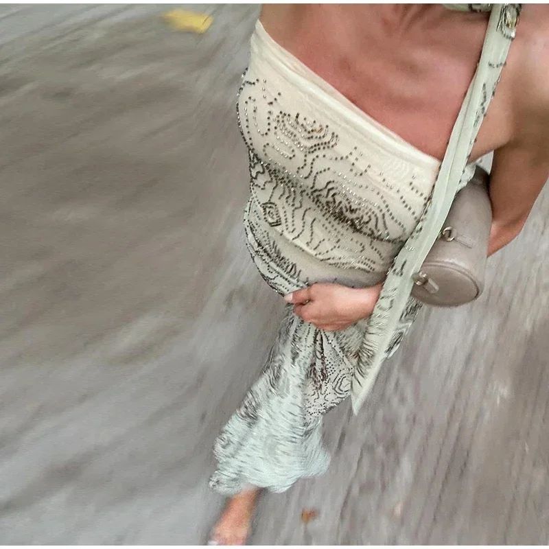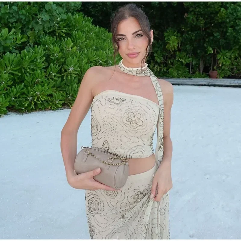2025 Elegant Women's Beaded Halter Top Skirt Set Sexy Sleeveless Printed 2-piece High Waist Long Skirt Beach Party Club Outfit