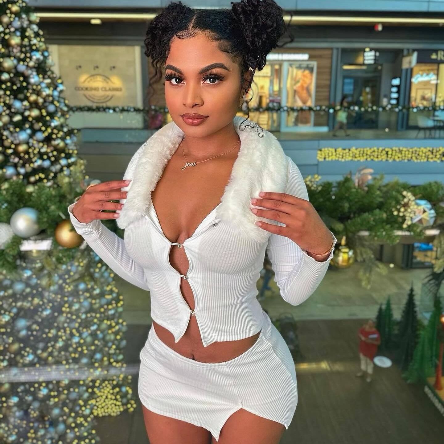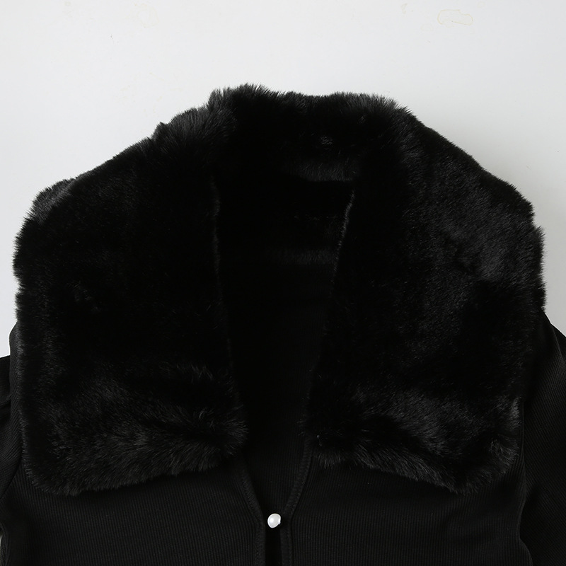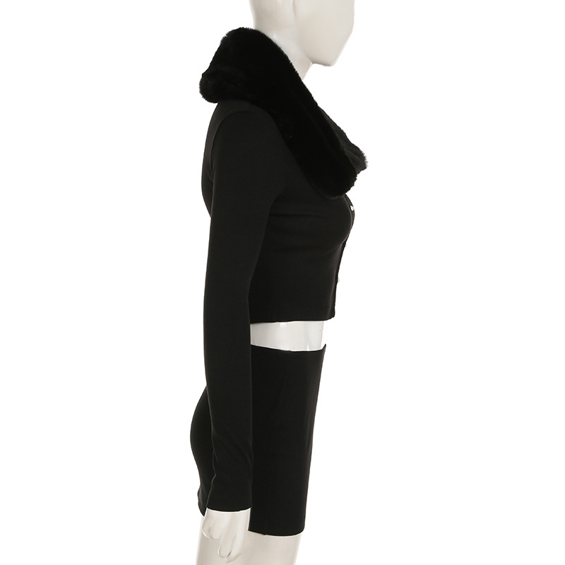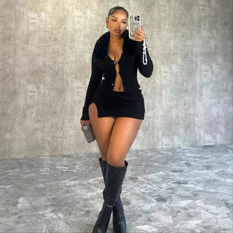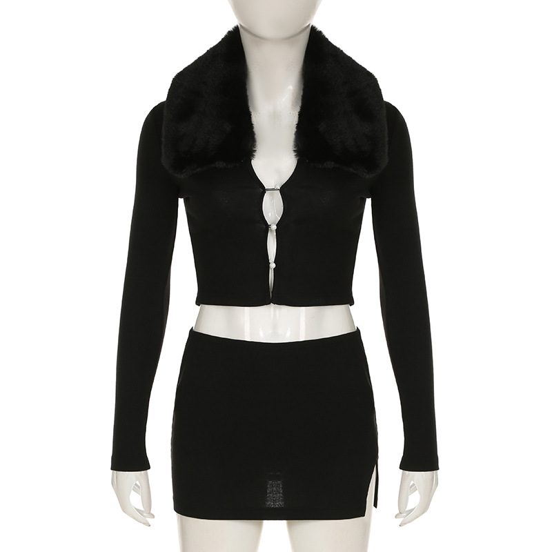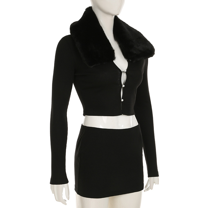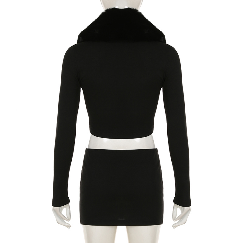 BKQU Sexy Fur Collar Hollow Crop Top Mini Skirt Women 2 Piece Set Autumn Elegant Knitted Bodycon Nightclub Dress Outfits 2024