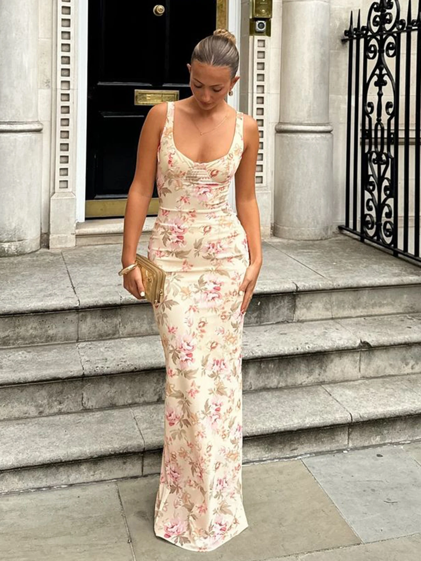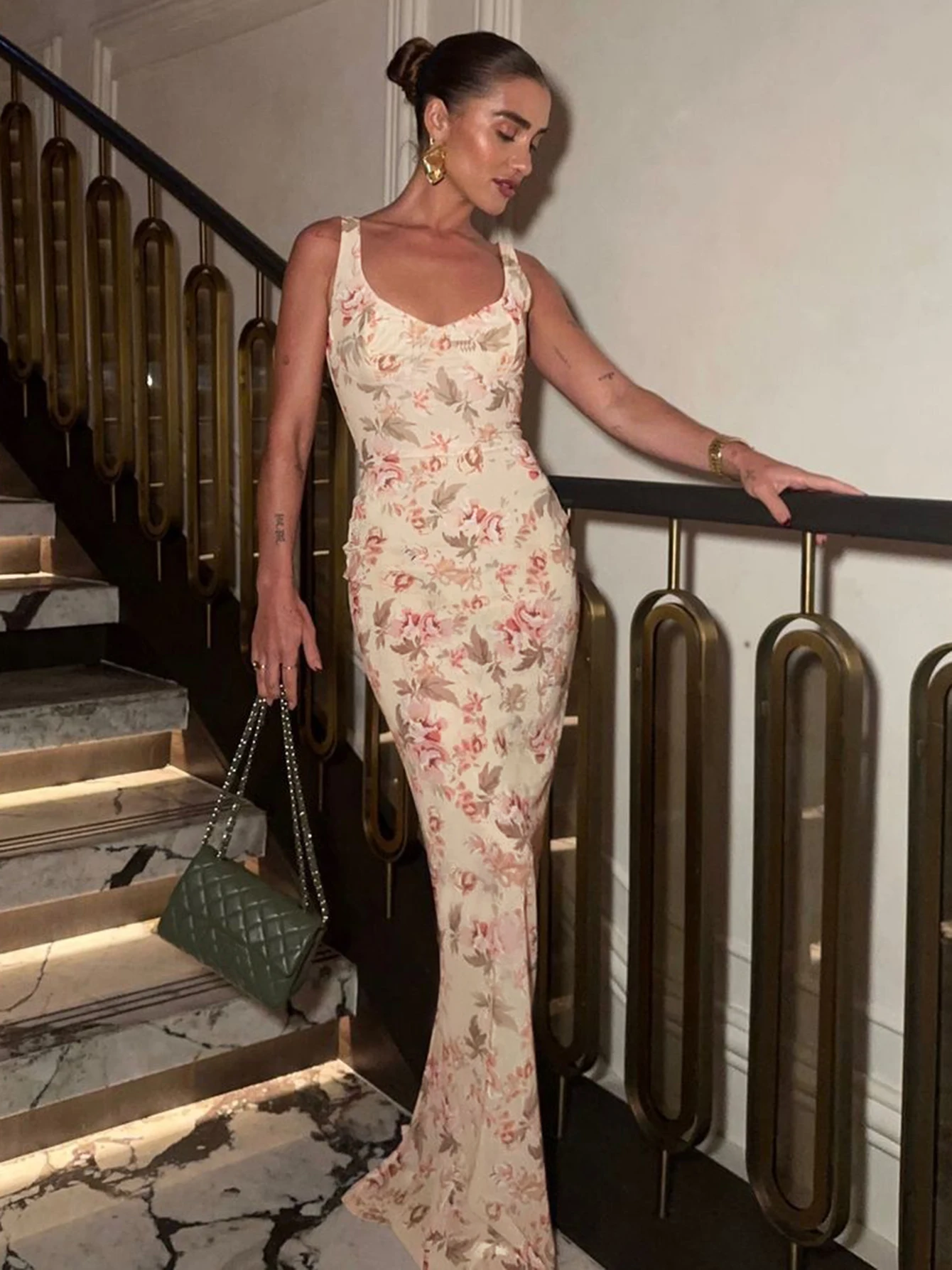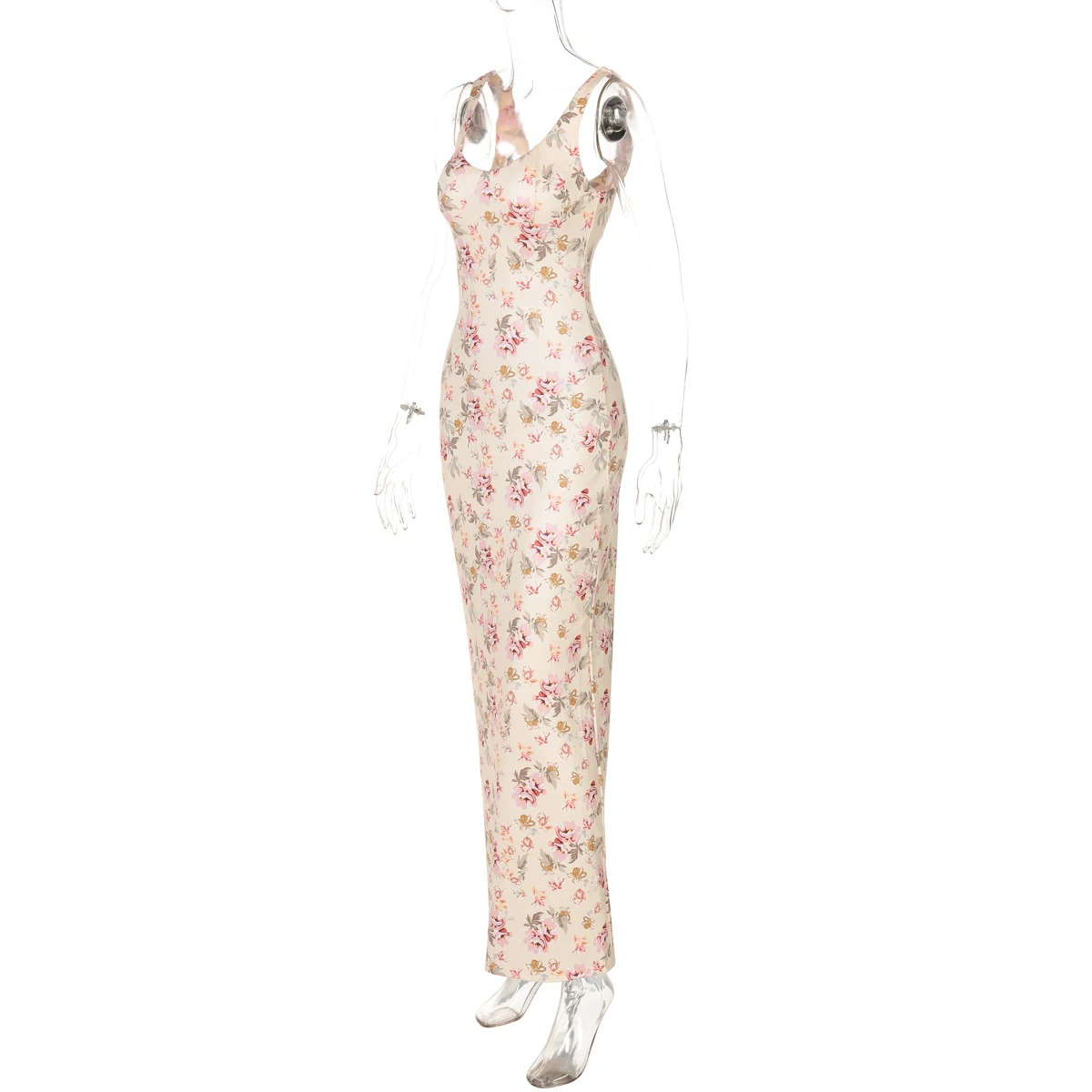 Dulzura Sleeveless Flower Print Maxi Dress Women’S Sexy Elegant Vintage Long Dresss Party Club Streetwear Spring Summer Outfit