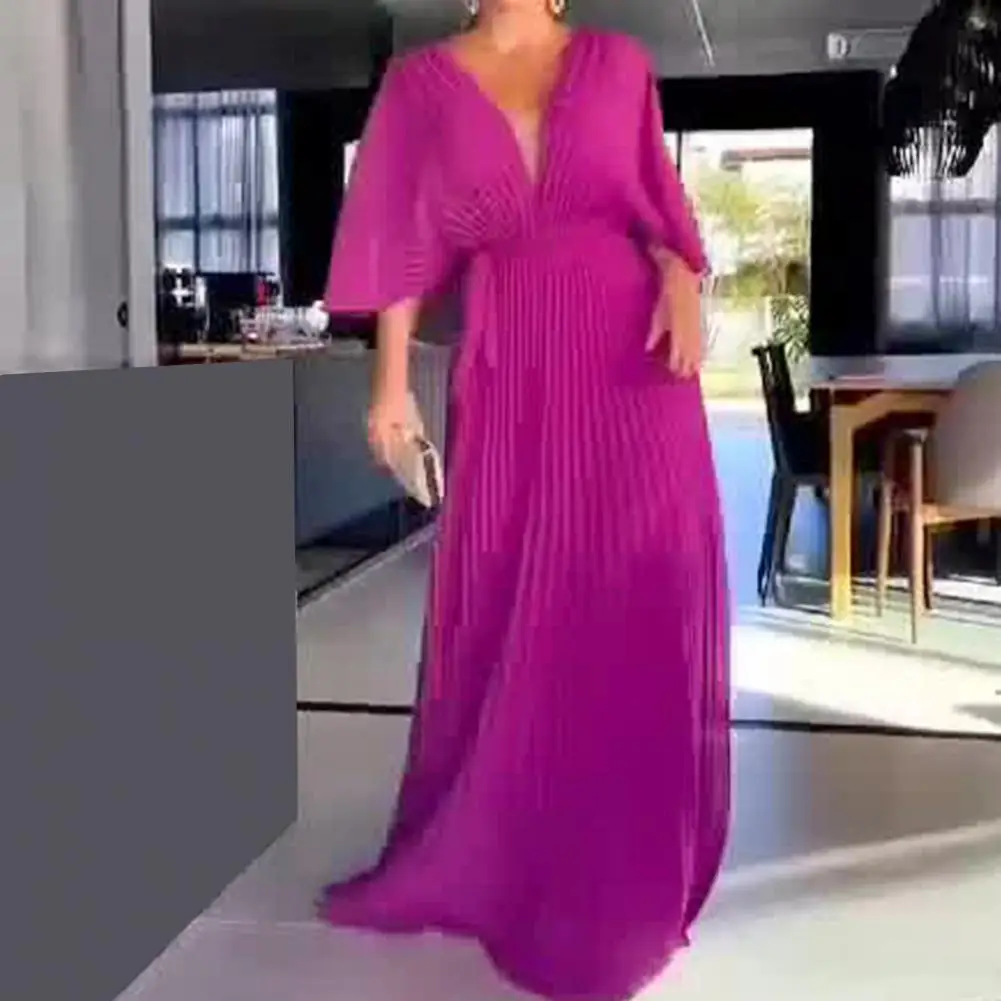 Elevate your style with our Elegant V-Neck Dolman Sleeve Evening Dress, designed to make you the center of attention at any special occasion! Why you'll love it: - Flattering pleated V-neck for a slimming look. - Luxurious, lightweight polyester for all-day comfort. - Stylish dolman sleeves that add a touch of elegance. - Versatile solid color perfect for any occasion. - Effortless fit available in various sizes. Crafted from premium polyester, this full-length dress features a loose fit that allows for easy movement, making it perfect for parties, proms, and cocktail events. The elegant pleated and slim waist design accentuates your curves, ensuring you look and feel your best. To wear, simply slip it on and pair it with your favorite accessories for a chic look. Ideal for casual outings, vacations, or evening events, this dress is a must-have for your wardrobe. Grab yours now and stand out in style!
