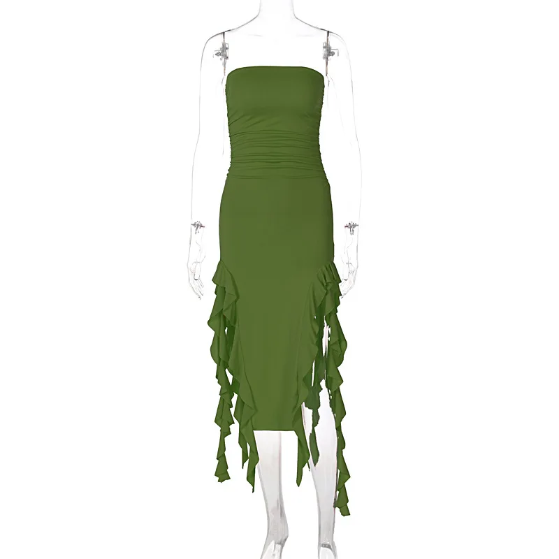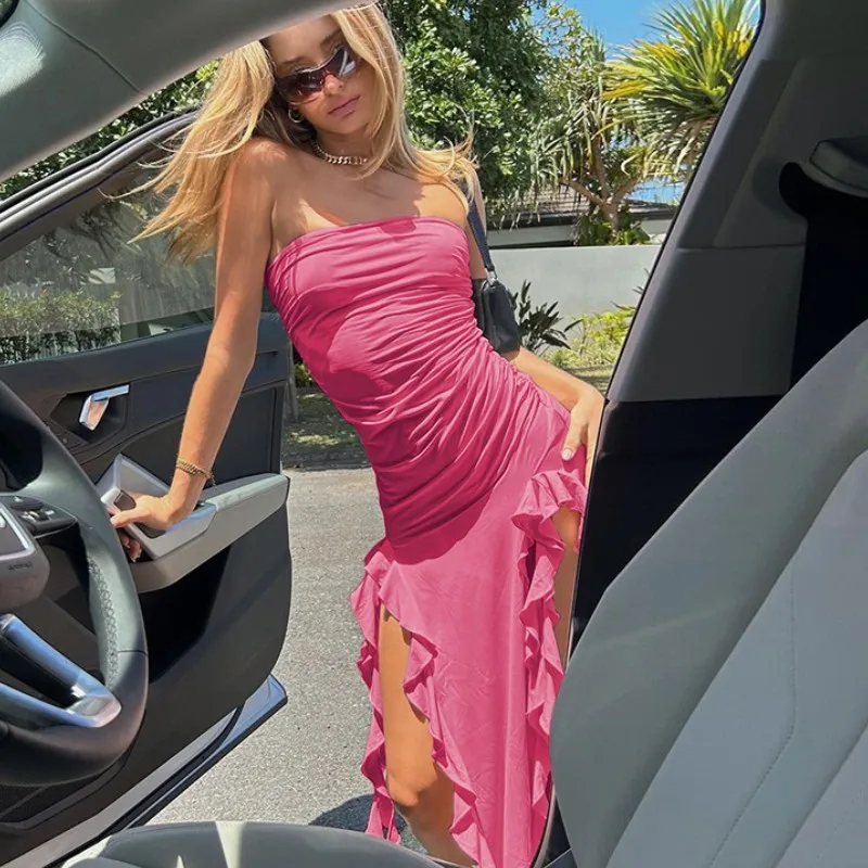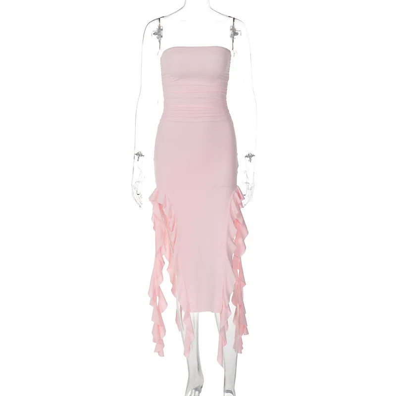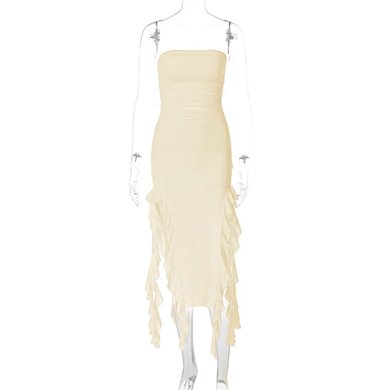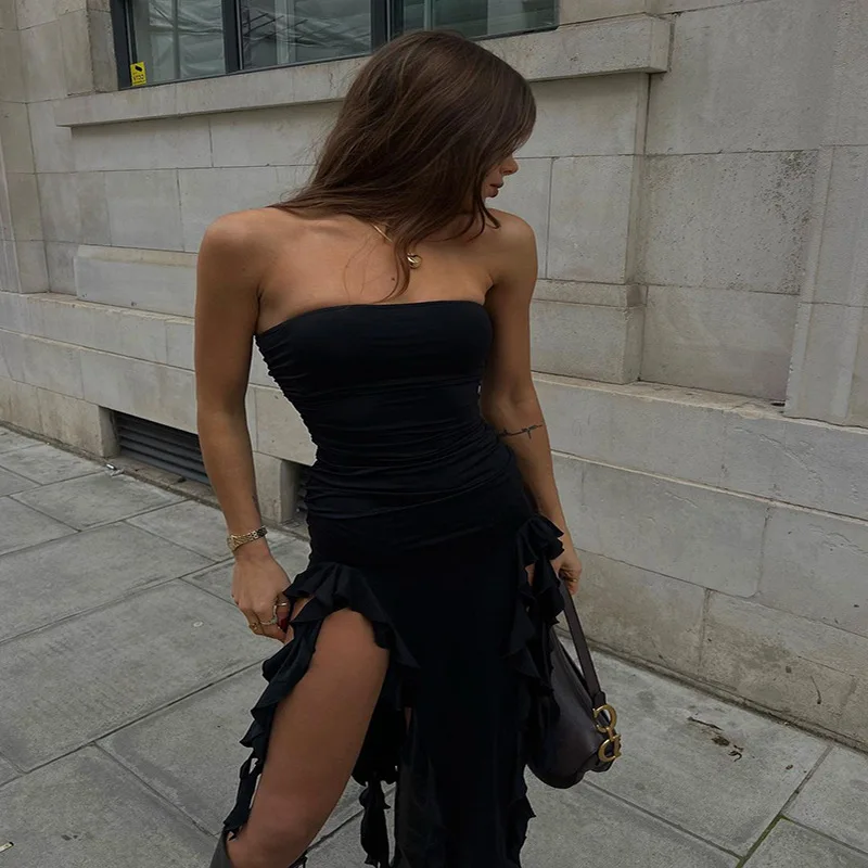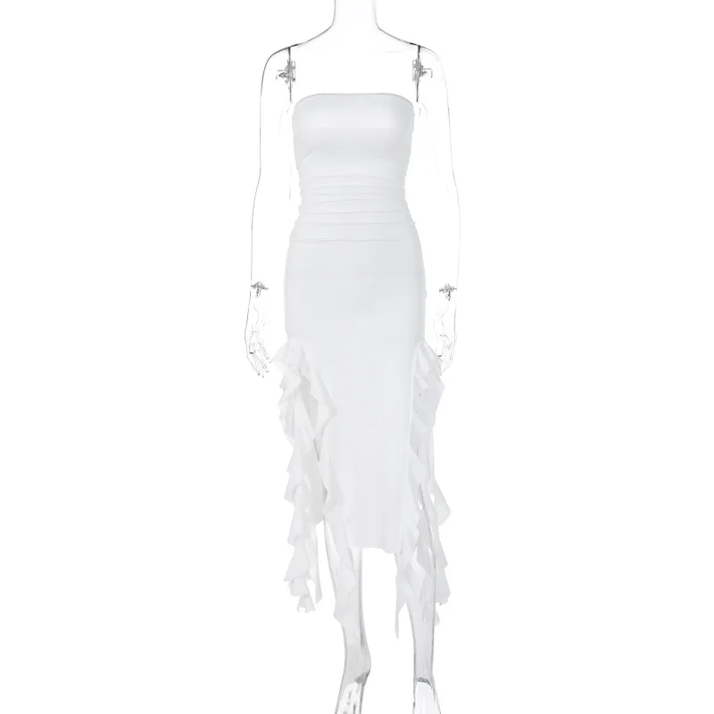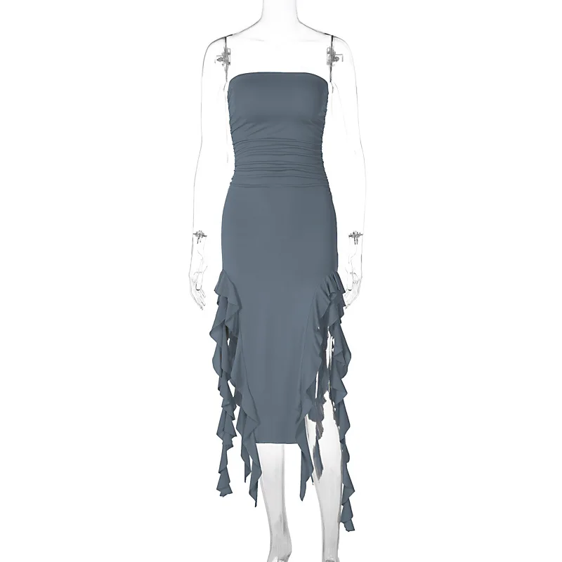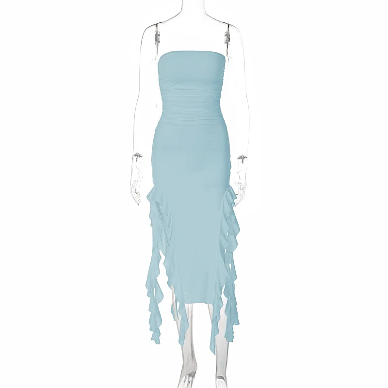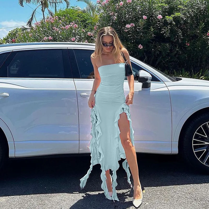 Women Sexy Split Slim Dresses Blue Ruffle Strapless Summer Fringe Dress Elegant Sleeveless Backless Vacation Club Party Outfits